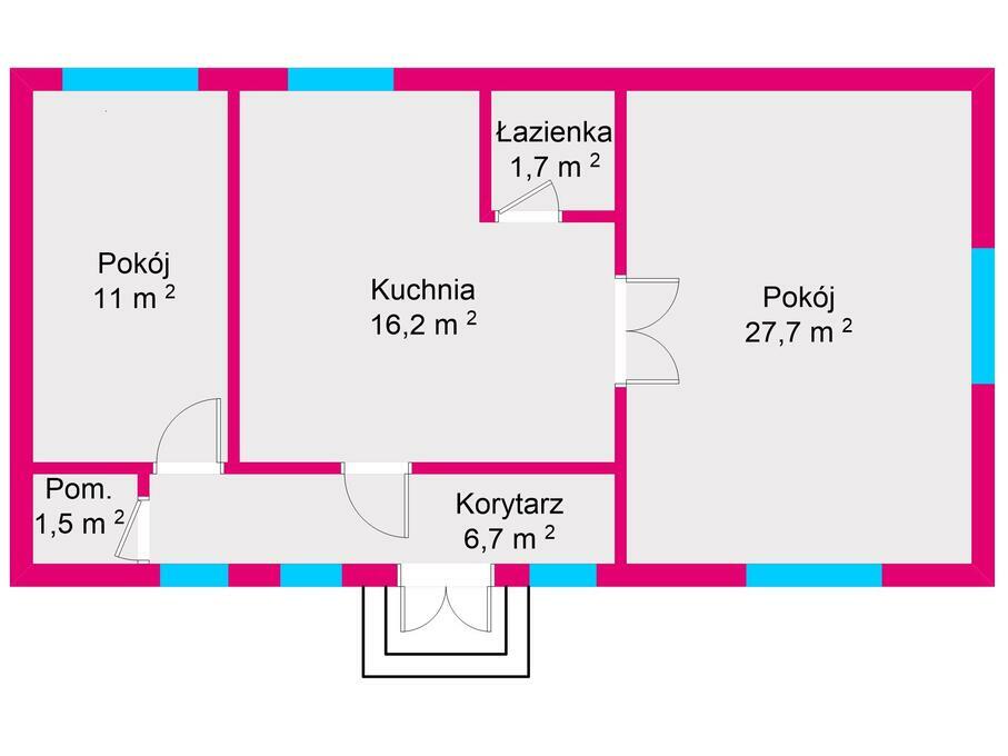 - 2 pokoje (27 m2 + 11 m2), duża kuchnia z częścią wypoczynkową o powierzchni 16 m2, łazienka z prysznicem o powierzchni 1,7 m2, korytarz-weranda,